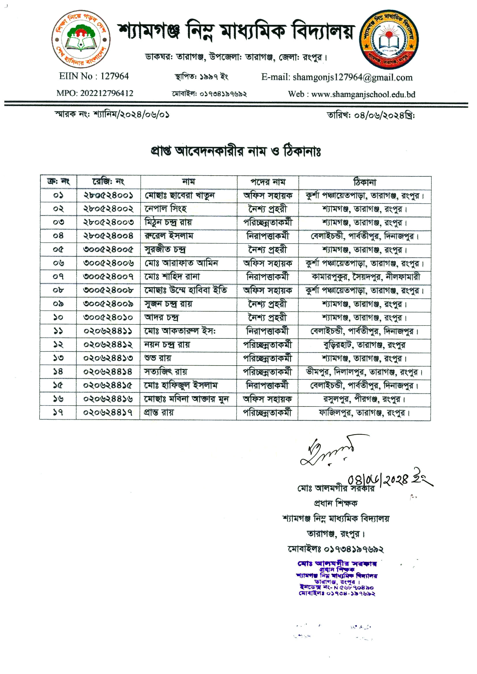 অফিস সহায়ক, নৈশ প্রহরী, পরিচ্ছন্নতাকর্মী ও নিরাপত্তাকর্মী পদের প্রাপ্ত আবেদনকারী তালিকা প্রকাশ